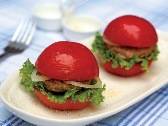 Thịt bò xay trộn đều với bột tỏi, bột nutmeg, nước tương, dầu ăn, đường và ướp khoảng 30 phút. Chia bò ra làm bốn viên tròn, đặt chảo láng ít dầu lên bếp cho thật nóng và chiên bốn viên thịt bò cho chín vàng bên ngoài. Sau khi chiên bò, cà chua cắt đôi theo chiều ngang, khoét bỏ bớt hạt rồi cho áp chảo nhanh tay tất cả cà chua. Dọn ra đĩa bằng cách cho viên thịt bò vào giữa hai miếng cà chua nhìn giống như hamburger, dọn ăn cùng hành tây xắt lát ngâm giấm và xàlách, rắc thêm muối tiêu và ketchup nếu thích.