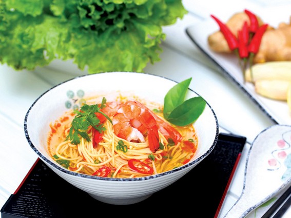 Nêm nước dùng với xốt tom yum và nước mắm cho vừa ăn, sau đó cho tôm và nấm rơm vào nồi nước dùng đang sôi nhẹ khoảng hai phút là được. Mì trụng nước sôi xếp vào tô, chan nước dùng với nấm và tôm vào từng tô xong cho rau ngò, lá chanh và ớt lên trên, dùng nóng.