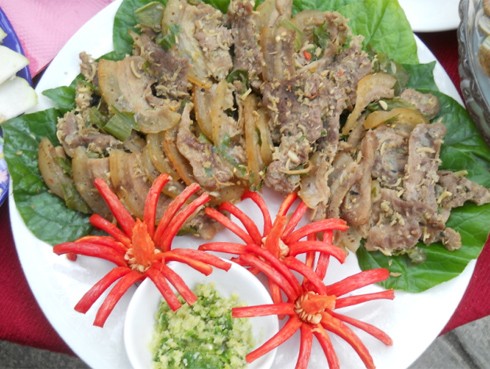 Món đầu tiên phải kể đến lợn mọi thui, lấy từ những con lợn non, không quá già. Lợn cạo lông xong, mổ bỏ lòng, nhét lá ổi, lá sả, hoặc lá lộc vừng vào bụng rồi thui vàng. Khi ăn, cắt một vạt thịt xắt từng lát chấm với muối ớt chanh. Nghe kể thì dễ thế nhưng không phải ai cũng làm được, người không chuyên món ăn sẽ không như ý.
