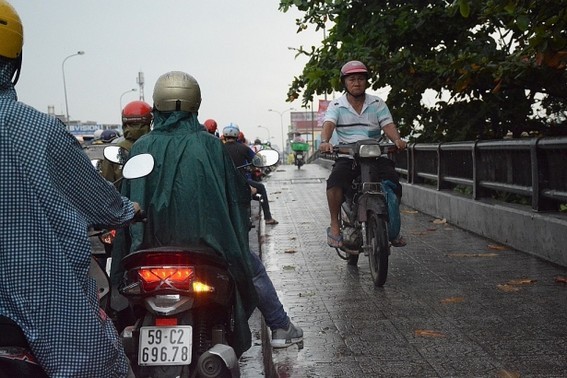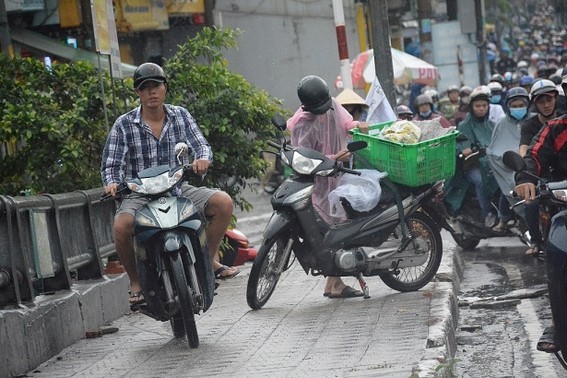 Nhiều người điều khiển xe máy trên cầu chạy ngược chiều.