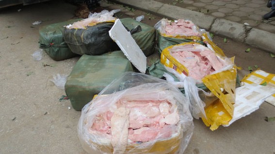 Qua kiểm tra, lực lượng chức năng xác định trong 2 bao tải chứa toàn nầm lợn đông lạnh, trọng lượng 100 kg. Thanh niên khai nhân thân là Phạm Văn Cứ, 34 tuổi, quê Kim Động, Hưng Yên. Cứ không xuất trình được giấy tờ chứng minh nguồn gốc số nầm trên.