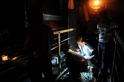 Nhân viên tàu đang đưa thi thể nạn nhân dưới gầm tàu ra ngoài
