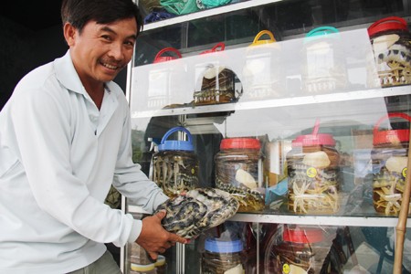 Chủ quán Bửu giới thiệu sản phẩm đẻn sống và rượu đẻn.