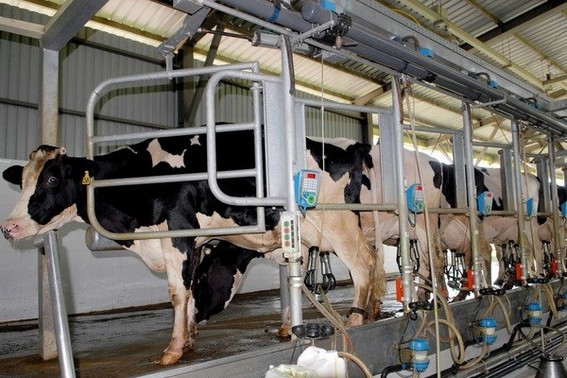 Hệ thống vắt sữa bò tự động. (Ảnh: Mạnh Linh/TTXVN)