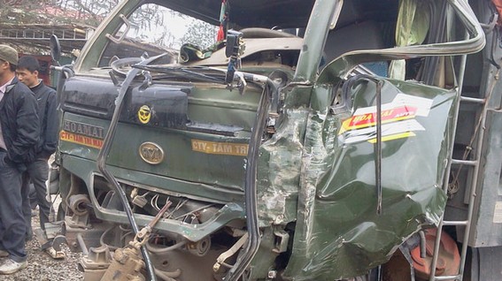 Chiếc xe tải đang đổ đá xây dựng cho một hộ dân tại xóm 16 xã Diễn Yên, trong lúc lùi ra mặt đường để đổ đá đã bị xe đông lạnh lưu thông hướng Hà Nội - Vinh bất ngờ lao đến tông ngang khiến đầu xe tải bẹp dúm.