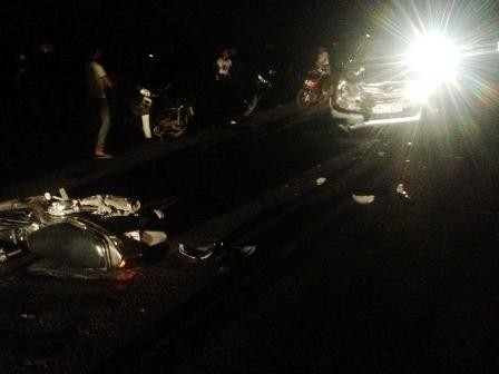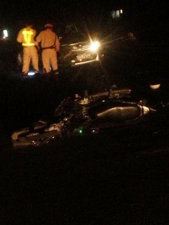Dantin - Trong đêm tối chiếc xe máy do nam thanh niên điều khiển chạy tốc độ cao trên quốc lộ đã đâm trực diện vào đầu ô tô con chạy ngược chiều. Vụ tai nạn khiến người điều khiển xe máy chấn thương nặng, đầu xe ô tô bị toác, chiếc máy vỡ nát.