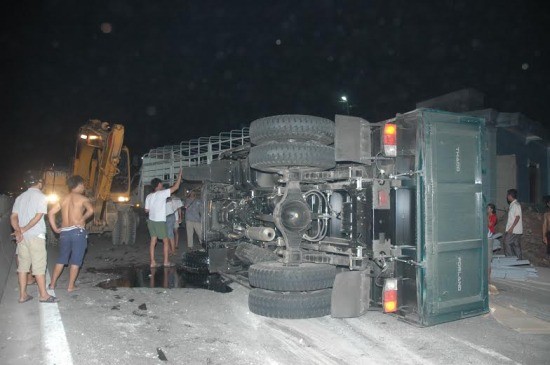Đang lưu thông trên Quốc lộ 1A, chiếc xe tải bất ngờ mất lái, trèo lên dải phân cách rồi lật nhào khiến 10 tấn thép tràn ra đường, giao thông bị ách tắc, tài xế bị xây xát nhẹ.