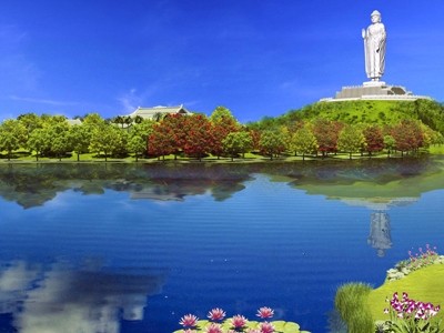 Chỗ này vốn gọi là đồi Mả Khách - tương truyền vì vị trí đẹp nên từ xưa người Trung Quốc đã táng ở đây. Các thầy phong thủy ngày nay đều khuyên trấn tượng Phật vào để làm vượng khí toàn khu vực. Tượng Phật cao 48m bằng bê-tông do nghệ nhân lão thành Thụy Lam ở Đà Nẵng thiết kế sẽ là đích đến của trục Thần đạo - con đường băng qua khu nghĩa trang theo trục Tây Bắc - Đông Nam.