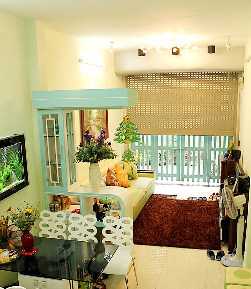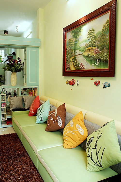 Ấn tượng đầu tiên với khách ghé thăm là sự kết hợp hài hòa, nhã nhặn và dịu mắt giữa các tông màu xanh đi kèm với những gam màu sáng nhẹ trong không gian phòng khách. Bằng màu nền tươi sáng, anh Tuyến đã chọn cho mình được một phương án hợp lý để làm nổi bật những sắc màu vui nhộn của các vật dụng trong nhà.