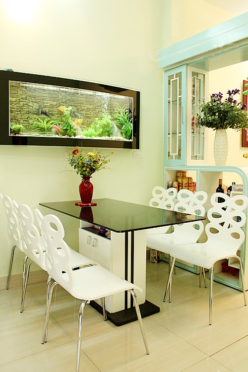 Cũng ngay tại bàn ăn là một bể cá xanh mướt nho nhỏ tạo cảm giác thư giãn và thoải mái cho mọi thành viên trong gia đình.