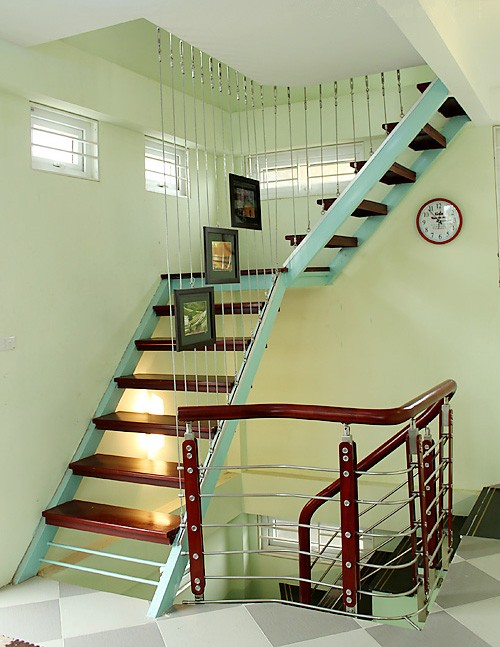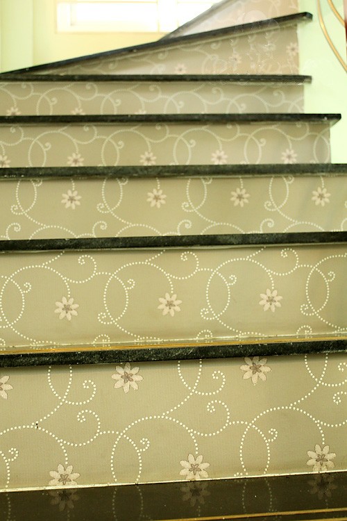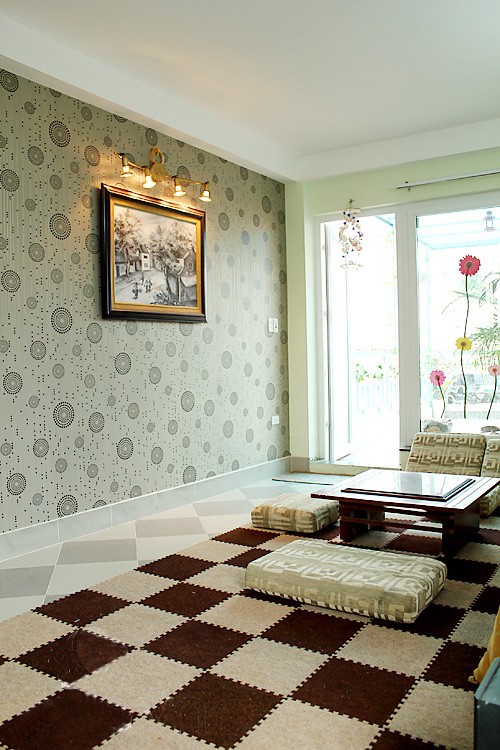 Muốn mang tới sự mới mẻ và độc đáo hơn cho căn nhà của mình, anh Tuyến sử dụng giấy dán tường cho cả các bậc cầu thang lên xuống trong nhà.