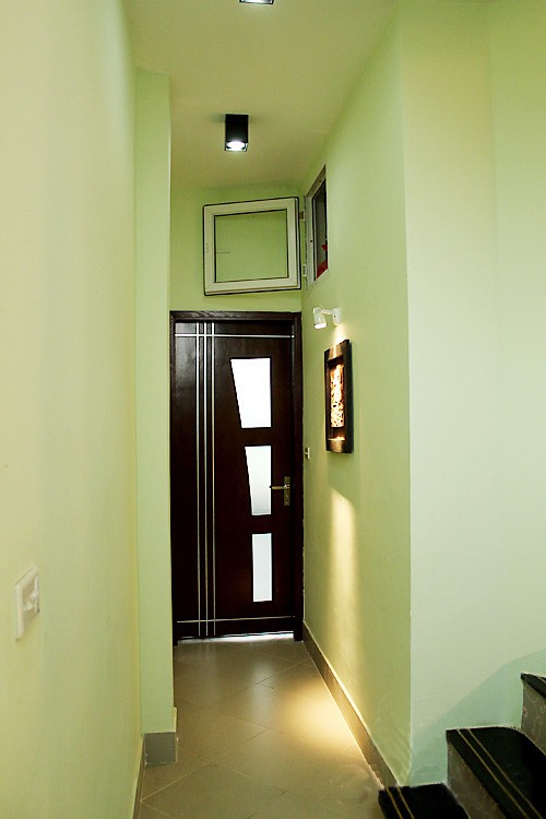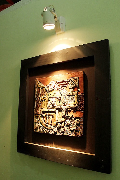 Hành lang dẫn lối vào phòng ngủ bố mẹ được thiết kế khá gọn với điểm nhấn duy nhất là bức tranh bằng gốm. Tuy nhiên sắc độ nền tường, màu đèn và màu tranh được phối hợp chưa hợp lý nên tạo cảm giác hơi ảm đạm.