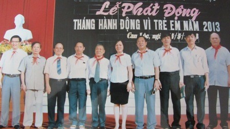 Ông Dinh (ngoài cùng bên phải) trong buổi lễ phát động Tháng Hành động vì trẻ em nghèo. Ảnh: Trần Mơ