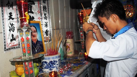 Bằng - con trai lớn của chị Nhân - thắp nhang bên bàn thờ người mẹ vừa qua đời