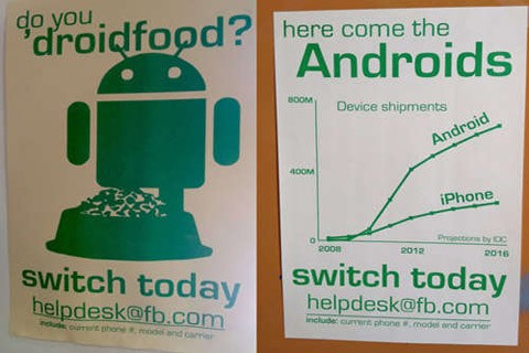 Tấm poster cổ động của Facebook có một đồ thị lớn từ IDC dự đoán thị phần Android sẽ gấp đôi iPhone vào năm 2016. Mọi poster đều khuyến khích nhân viên liên hệ với bộ phận giúp đỡ ngay lập tức để sắp xếp chuyển sang Android. Khi được hỏi về tấm poster, một đại diện của Facebook trao đổi với TechCrunch: “Chúng tôi không khuyến khích cái này thay vì cái khác. Chúng tôi để nhân viên tự lựa chọn.”