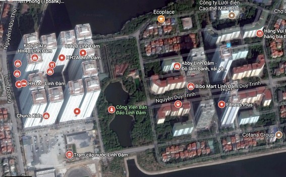 Đường Nguyễn Duy Trinh phải chịu tác động của mật độ dân số quá lớn từ các dự án lân cận, đặc biệt là từ khối nhà HH của Khu đô thị Linh Đàm. (Ảnh: Google map)