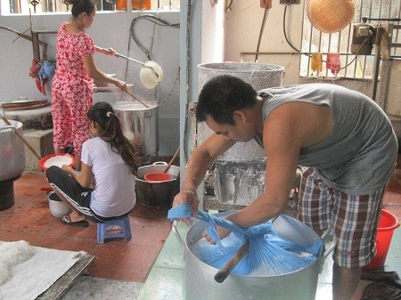 Sau khi gạo được ngâm bở ra, đem xóc sạch rồi xay nhuyễn với nước để khoảng 2-3 đêm cho bột lên men. Anh Yến bật mí, muốn bột bún được mềm mịn, quánh thì trong lúc đánh bột, người làm bún thủ công sẽ khéo léo cho vào một ít hồ đã được khoắng đều. Tạo hồ bằng cách thả bột hồ vào trong nước sôi vừa đủ và dùng dụng cụ đánh cho hồ bông lên và quánh vào nhau. Sau khi bột bún đã dẻo như mong muốn, dùng một manh màn rộng đặt trong một chiếc nồi hoặc chậu lớn để lọc bột. Khâu này dù là phụ nhưng sẽ giúp cho quá trình vắt bún thuận lợi hơn. Manh màn sẽ giữ lại những sạn, bụi tấm hay cục bún nhỏ chưa tan để lấy lại tinh bột trước khi đưa vào khuôn vắt.