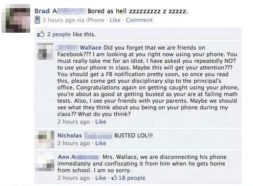 Mrs Wallace: Em đã quên rằng chúng ta là friend trên Facbook? Tôi đang nhìn thấy em sử dụng điện thoại. Em chắc phải nghĩ tôi là một tên ngốc. Tôi đã yêu cầu em rất nhiều lần KHÔNG sử dụng điện thoại trong giờ học. Liệu em có thể thực hiện được không?