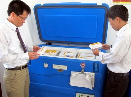 Cán bộ Trung tâm Y tế dự phòng tỉnh Ninh Bình kiểm tra vắc xin Quinvaxem cấp cho các đơn vị. Ảnh: Nguyễn Trường