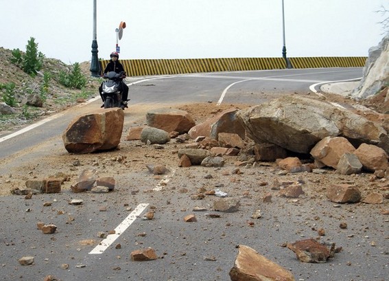 Những tảng đá lớn lăn từ trên núi xuống chắn ngang mặt đường. (Ảnh: Công Thử/TTXVN)