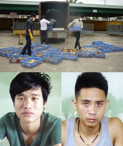 Xe “điên” bị bắt cùng 7.100 con gà giống nhập lậu, lái xe Hoàng Quốc Quân (ảnh dưới bên trái) và chủ hàng gà lậu Nguyễn Đắc Trung.