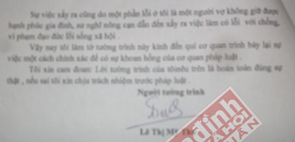 Bản tường trình tự thú chuyện ngoại tình của người vợ. Ảnh HT.