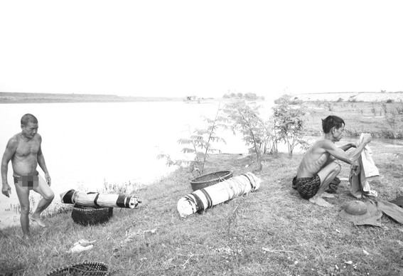 Nắng vẫn chói chang. Trên dòng sông, ông Yên bắt đầu lấy hơi và ngụp xuống. Mặt nước hơi xao động như nuốt chửng lấy ông. Được biết, một người có hơi lặn giỏi cũng chỉ được hơn một phút. Thời gian chậm chạp trôi, 20 giây, 40 giây, 50 giây rồi đến kim đồng hồ chỉ tới 1 phút. Thật đáng kinh ngạc. Đến 1 phút 20 giây mà vẫn chưa thấy ông Yên nổi lên. Đâm lo, tôi bảo: “Hay là có chuyện gì”. Ông Tài, một thợ ngốc vầu thản nhiên nói: “Yên tâm, lão này hơi dài lắm, phải tới 1 phút 30 đấy”. Vừa dứt lời. ông Yên đã trồi lên khỏi mặt nước, bám vào phao lấy hơi. Vuốt nước ở mặt, ông cười lớn nói với lên: “Trúng ổ rồi, gần 20 chục con. Khá đấy. Nước chỗ này sâu dễ có đến 15 mét”.