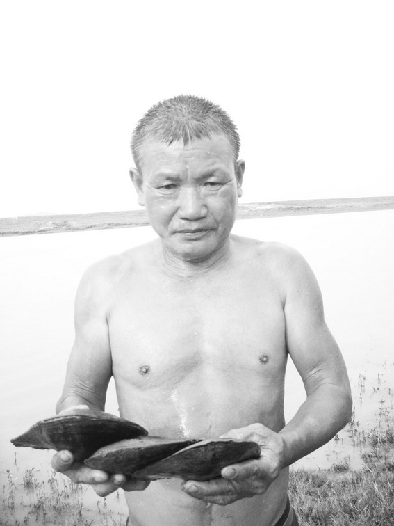 Thế rồi cứ như vậy hơn chục lần nổi lên mặt nước lấy hơi xong ông Yên lại ngụp xuống. Có lẽ xề trai đã tương đối. Ông Yên theo dây thừng nổi lên bán vào cái phao xốp và bơi vào bờ. Đẩy cái phao gần bờ, ông bắt đầu khom lưng kéo dây thừng. Cái xề đã được kéo nổi lên mặt nước, ông Yên khệ nệ bưng lên. Lưng xề trai, phần lớn là trai to có rìa, những con trai đen bóng, chắc nịch, ước khoảng 3 con được 1kg. Loài trai to thường sống ở độ sâu từ 10 dến 15 mét, con to nặng gần 0,5kg.
