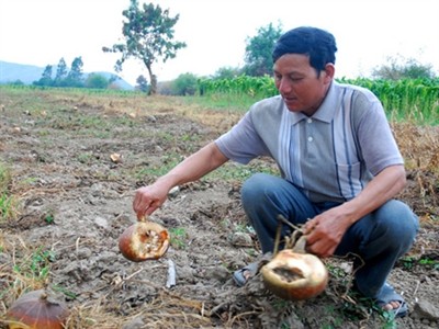 Ruộng bí rộng hơn 8 sào của ông Lê Mai (thôn 3, xã Hòa Tân, huyện Krông Bông) nhiều tuần nay khô héo dần, ông Mai thu hoạch để vớt vát nhưng bí không bán được vì quả nhỏ. “Công sức cả gia đình xem như mất trắng. Trồng 8 sào bí mà tôi thu được có hơn... 2 tạ, đem bán bị chê là bí nhỏ nên phải đổ số bí này” - ông Mai chua xót.