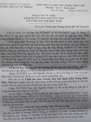 Dùng Facebook ra lời kêu gọi “Tuyên Ngôn Học Sinh...” kèm lời lẽ thóa mạ, xúc phạm thầy cô giáo, một nữ sinh lớp 8/6 Trường THCS Lý Tự Trọng tại phường An Xuân, TP.Tam Kỳ, Quảng Nam đã phải nhận kỷ luật.