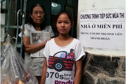 Cô Hòa (đeo kính) và một thí sinh được cô cho ở miễn phí trong thời gian đi thi. Ảnh: Quốc Định