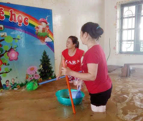 Nước bắt đầu rút công tác chùi rửa đang được tiến hành triển khai. Các cô giáo trường mầm non Phương Mỹ làm vệ sinh nhà trường ngay khi nước rút.
