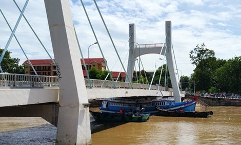 Tàu cá bị mắc kẹt dưới gầm cầu Lê Hồng Phong (TP Phan Thiết, Bình Thuận)