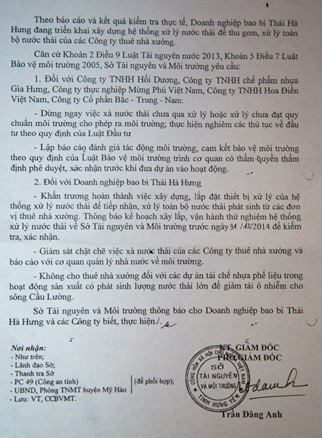 Văn bản về việc “Tạm dừng xả nước thải chưa qua xử lý ra môi trường” do Phó Giám đốc sở Trần Đăng Anh ký