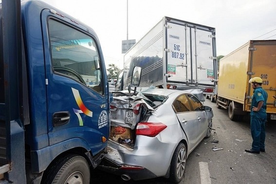 Xe của anh Tài tiếp tục va chạm với một xe tải khác. May mắn, vụ tai nạn liên hoàn không có thương vong về người.