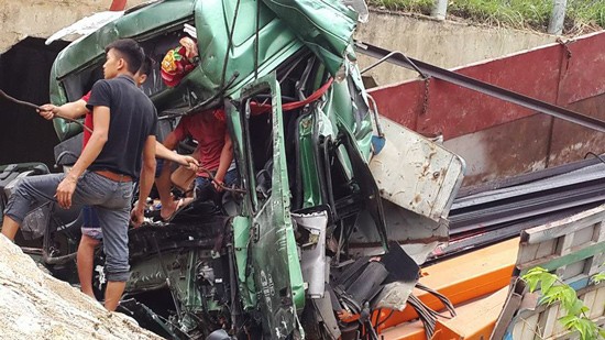 Tại hiện trường, phần đầu xe đâm trực diện vào vách đá kè cống dẫn đến móp méo, biến dạng hoàn toàn. Bên trong cabin tài xế và phụ xe vẫn đang bị mắc kẹt.