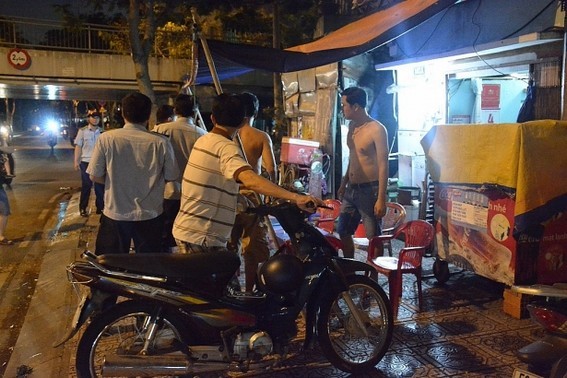 Tại một ngôi nhà trên đường Hoàng Sa, chủ nhà cho căn bạt làm mái che bao trọn vỉa hè. Bàn ghế, ly chén, bếp... để trên cả hè để nấu ăn. Trước quán này còn có máy móc và nhiều vật dụng để xay bột.