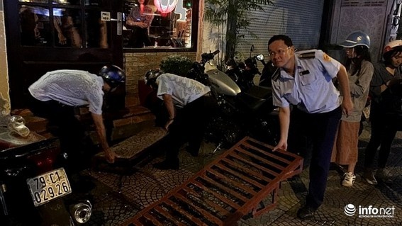Mặc trời đổ mưa, tối ngày 9/8, Phó chủ tịch UBND quận 1 Đoàn Ngọc Hải và đoàn công tác liên ngành của quận vẫn tiếp tục công việc lập lại trật tự vỉa hè trên các tuyến đường thuộc địa bàn.