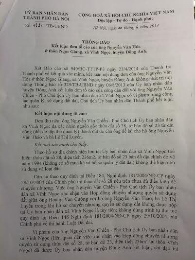 Thông báo kết quả giải quyết đơn tố cáo, chỉ rõ những sai phạm của vị Phó Chủ tịch UBND xã Vĩnh Ngọc của UBND TP Hà Nội.