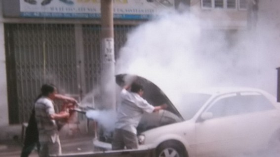 Một người dân gần đó chứng kiến cho biết vào thời điểm trên, chiếc ôtô do một người đàn ông điều khiển chạy từ Đại lộ Võ Văn Kiệt vào đường Trần Đình Xu. Ôtô này thắng đột ngột trước UBND P.Cầu Kho (Q.1), tài xế hoảng sợ bỏ chạy khỏi xe. Đầu xe ôtô bốc khói nghi ngút. Khi mở nắp ôtô lên, lửa tỏa ra dữ dội.