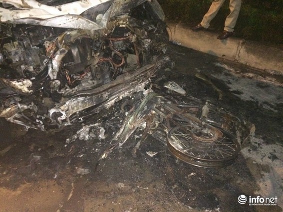 Khi xảy ra va chạm với ô tô, người điều khiển xe máy bị văng xuống đường và chỉ bị xây xát còn chiếc xe thì dính vào gầm ô tô kia, bốc cháy ngùn ngụt và bị kéo lê một đoạn đường khoảng hơn 100m.