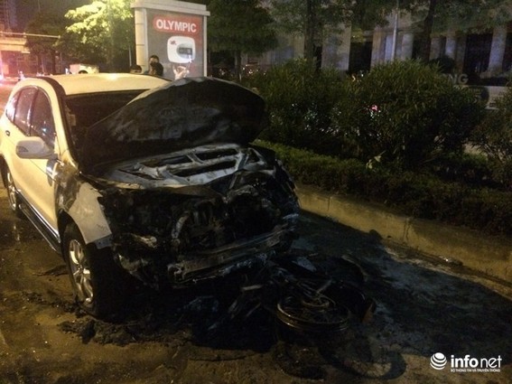 Chiếc xe máy cháy rụi hoàn toàn, ôtô cũng bị cháy và hư hỏng nặng phần đầu.