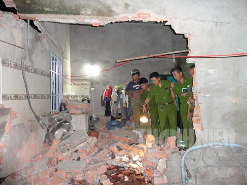 Người nhà nạn nhân cho biết, thi thể của anh Quỳnh và chị Bảy không còn nguyên vẹn sau vụ nổ. Anh Nguyên cũng bị thương do mảnh pháo ghim vào đầu. Toàn bộ phía sau nhà anh Nguyên bị hư hỏng nặng do sức công phá của quả pháo.