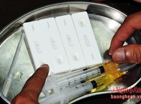 4 mẫu thử test nhanh tại lò mổ phát hiện 3 mẫu dương tính với chất tạo nạc. (Ảnh: Báo Nghệ An)