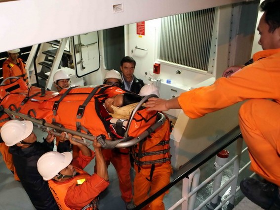 Chuyển ngư dân gặp nạn từ tàu lên bờ. (Ảnh: Trần Lê Lâm/TTXVN)