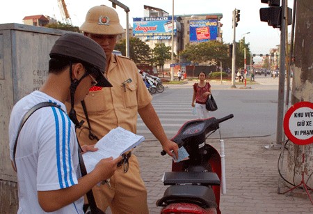 Cảnh sát giao thông Hà Nội cho người vi phạm giao thông đọc luật để xử phạt lỗi vi phạm. Ảnh: Xuân Tùng