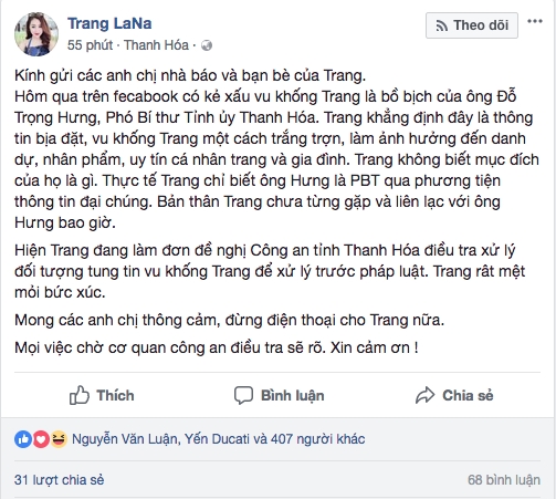Theo đó, nick facebook Trang LaNa đăng tải: “Kính gửi các anh chị nhà báo và bạn bè của Trang. Hôm qua, trên fecabook có kẻ xấu vu khống Trang là bồ bịch của ông Đỗ Trọng Hưng, Phó bí thư Tỉnh ủy Thanh Hóa. Trang khẳng định đây là thông tin bịa đặt, vu khống Trang một cách trắng trợn, làm ảnh hưởng đến danh dự, nhân phẩm, uy tín cá nhân Trang và gia đình.
