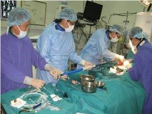 Các bác sỹ thực hiện kỹ thuật can thiệp - phẫu thuật tim mạch tại Bệnh viện Việt Đức.