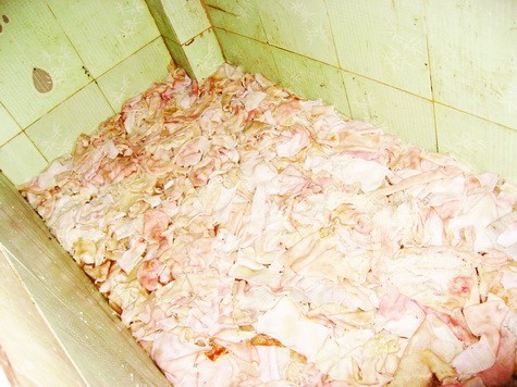 “Bì lợn được gia đình tôi thu mua ở khắp nơi, nhiều khi phải thuê người đi thu chuyển về đây rồi gửi qua xe khách nhưng nguồn hàng không phải lúc nào cũng sẵn nên nhiều khi người thu mua phải đợi, gom được số lượng kha khá mới gửi xe về. Thế nên, bì lợn đã có mùi ôi thối là không tránh khỏi”- bà chủ Nga biện minh.