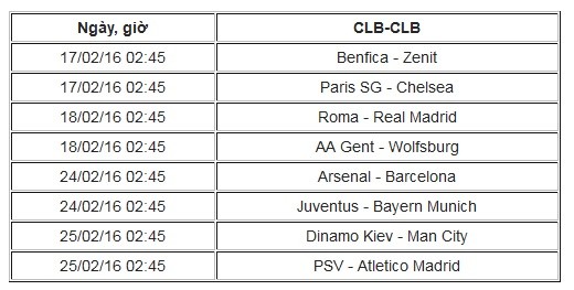 Lịch thi đấu lượt đi vòng 1/8 Champions League: